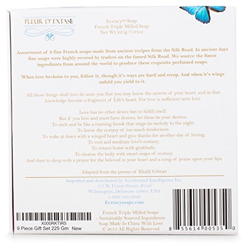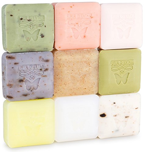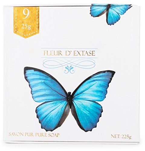 -. Feature : ALL NATURAL SOAPS GIFT SET - The Fleur D' Extase Soaps (Ecstacy Soaps) are Triple Milled ALL NATURAL soaps scented with natural essential oils. / NINE DIFFERENT SCENTED SOAPS IN ONE GIFT BOX - This saop gift box sampler contains nine 25 gram guest soaps in wonderful smelling scents - Perfect for sampling to find your favorite Fleur D'Extase scent / GREAT GIFT ITEM - These Natural Soaps are a great gift item and come in a beautiful gift box. Excellent house warming gift, white elephant gift, mothers day gift, or general gift item that most people would love to receive. / GREAT GUEST SIZED NATURAL SOAPS - Perfect sized soaps for your guests while they stay with you, or just to add to your bathrooms and/or kitchens / FREE OF TOXIC CHEMICALS - No Parabens, No Ethyl Alcohol, No Phenoxyethanol, No DEA - Not tested on animals