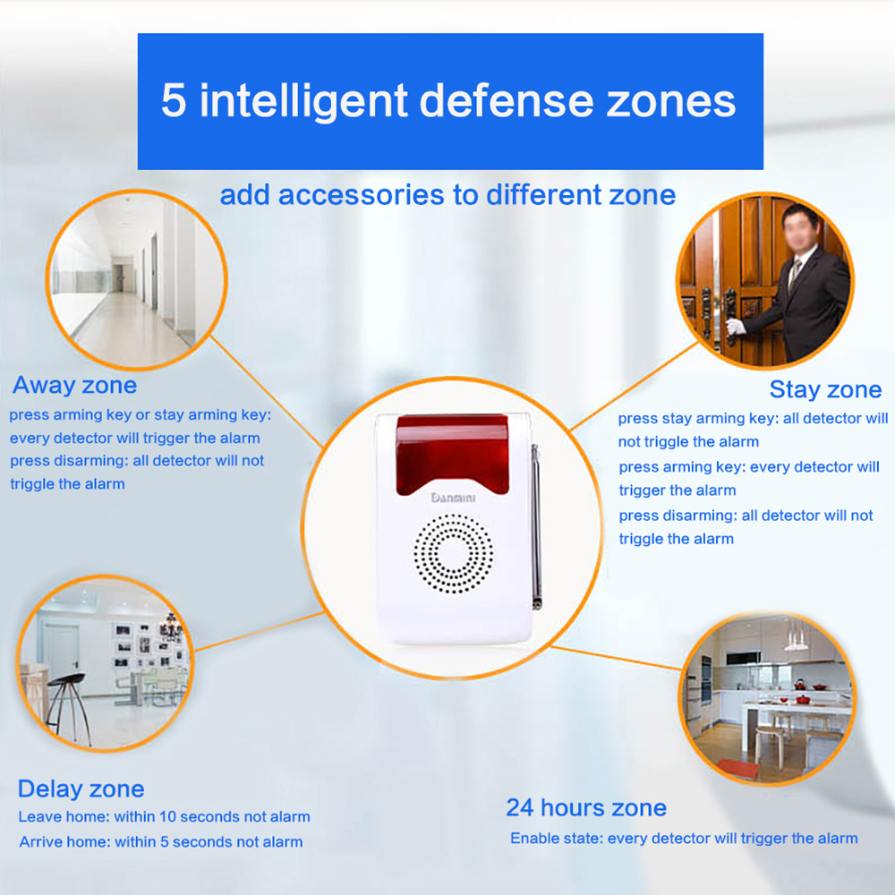 - 5 main defense zones, each zone can study 32 detectors, data no lose when power off.Away zone: detectors in this zone will trigger the alarm when set arming/ stay arming; disarming, not trigger the alarm. This apply to all area.