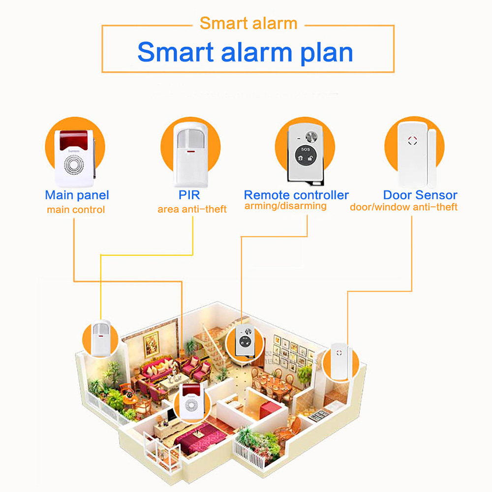 - Wireless alarm kit,with Main Panel,PIR,Remote Controller,Door Sensor.