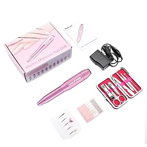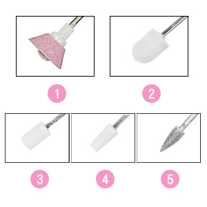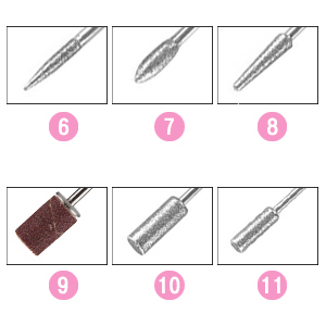 (1)ピンクのヘッド:爪のエッジを滑らかにする(2)鋼玉ヘッド:爪の表面にを磨く輝きに導く(3)円筒形鋼玉ヘッド:表面の凹凸を滑らかにする(4)円錐形鋼玉ヘッド:表面のエッジを滑らかにする(5)エメリーヘッド:まわりの角質を取り除く(6)針ヘッド:爪のエッジを輝きに導く(7)安全ヘッド:爪の側縁を磨く滑らかにする(8)コーンヘッド:皮膚に近く爪を整える(9)研削ヘッド:厚い爪を磨き、甘皮を処理する(10)大きい円筒形ヘッド:厚い爪を磨き、短くする(11)小さい円筒形ヘッド:厚い爪を磨く低音設計