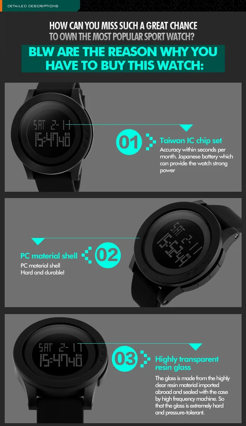 Feature:Water Resistant,LED display,Complete Calendar,Shock Resistant,Alarm,Chronograph