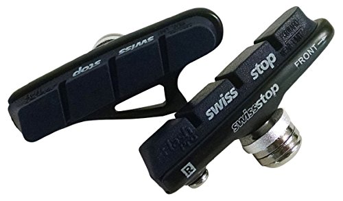 Compatible with both Shimano and SRAM brakes, Swisstop Full FlashPro Elite Black Prince Brake Pads are for carbon rims only. The 'Full' in SwissStop Full FlashPro means that this brake pad kit comes with pads and holders. There will be no stripped set screws or lost parts. Simply remove your old, worn out pads and bolt on something better. SwissStop has over 70 years of experience in working with technical rubber compounds that allows them to produce brake pads with tuned performance characteristics. SwissStop pads have superior stopping power, low pad-wear rates, very linear brake response, and a smooth, quiet performance. Think of them as the Assos or the SRM of brake pads. FlashPro means one thing: These are compatible with Shimano and SRAM brake calipers. To better the performance over the previous Flash pads, the FlashPro has deeper asymmetrical grooves and a more pronounced leading edge profile. The idea is to "squeegee" away more water to improve the wet weather performance and the deeper grooves help give the pads better modulation. SwissStop increased the total pad depth with more material above the wear line -- good news for those folks that live in the high mountains. Known for its excellent modulation, the Black Prince compound brings the feel of braking on aluminum to carbon rims, and offers powerful braking in all weather conditions, including cold and rain.Feature