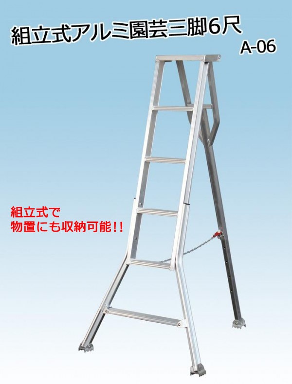 | 業界初の組立式アルミ園芸三脚!箱入りでコンパクト!物置にも収納可能です。植木の込み入った中でも入れる狭い登り階段。組立式。 |