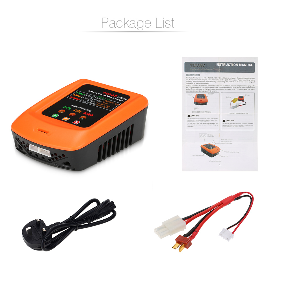 TE3AC professional balance charger is an economic, high quality 100-240V AC balance charger, designed for charging LiPo and LiFe batteries from 2/3 cells in balance mode. NiMH batteries from 1S-8S cells in the 3S cells balance socket. The circuit power is 25W and max charge current can reach to 3A. TE3AC charger can check batteries' capacity and charging with 1C current.