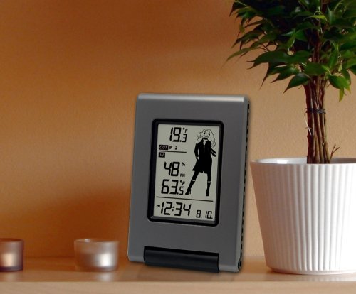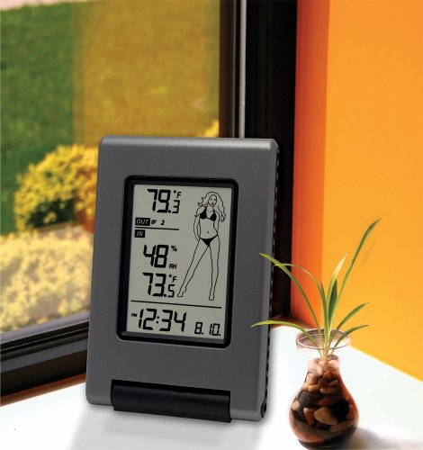- Feature : Temperature display with atomic clock, wireless sensor and dress-for-weather icons / 8 icons suggest what to wear; atomic clock sets itself and adjusts automatically for DST / Displays outdoor temps, and indoor temperature and humidity with high and low records / Wireless transmission range up to 330 feet; requires 4 AAA and AA batteries / Indoor display mounts to wall or rests on desktop stand; receiver measures 5 1/3 by 3-3/4 by 3/4 inches