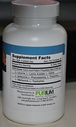 -. Feature : Super Amino 23 ......Master Amino Acid PatternTM is pre-digested 100% vegetarian protein that has been featured in the Physician's Desk Reference* and is comP.R.Ised of non-soy legumes. For fitness goals, we recommend combining it with the Power ShakeTM. / •Aids in normalizing protein synthesis •Assists with the stabilization or recovery of muscle strength, endurance, and volume •Helps keep body tissues firm •Helps minimize body fat / Servings per container: 30 Ingredients: Patented proP.R.Ietary blend of (non-soy) legumes. Amount per Serving of MAPTM 5000 mg: L- Leucine, L- Valine, LIsoleucine, L- Phenylalanine, L- Threonine, L- Methionine, L- Tryptophan, L- Lysine / Instructions: Take 5 tablets daily. As an exercise aid take 5 - 10 tablets, 30 minutes P.R.Ior to exercise. For those seriously intent on gaining muscle or losing weight, take 1-2 tablets per every 25 lbs of body weight on a daily basis. / For best results: Take 2 hours BEFORE or at least 3 hours AFTER taking other protein/amino acids sources (meat, eggs, dairy, jello, beans, bananas, lentils, nuts, grains, breads, cereals, oatmeal, soy products, etc.). Purium green drinks can be taken 30 minutes after taking Master Aminos.