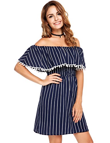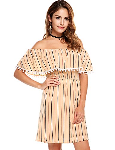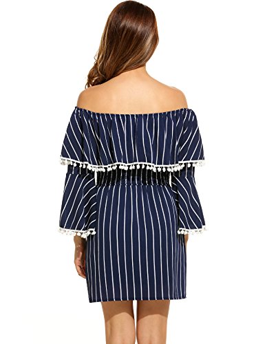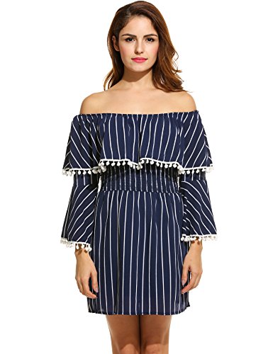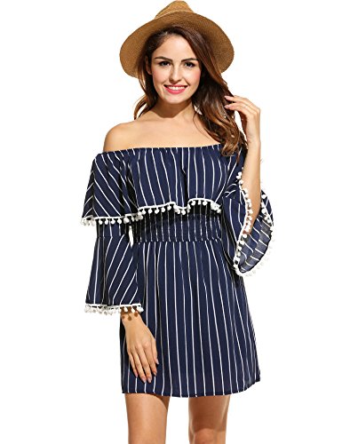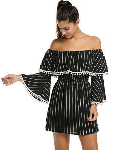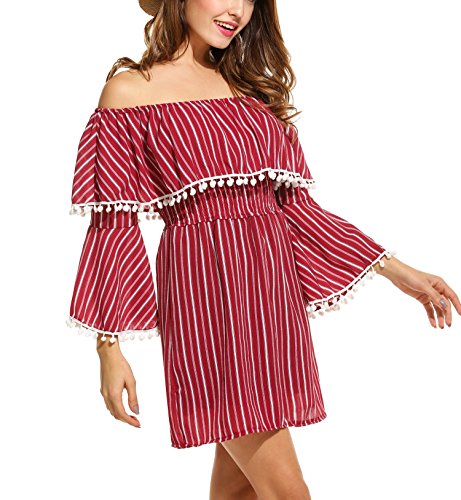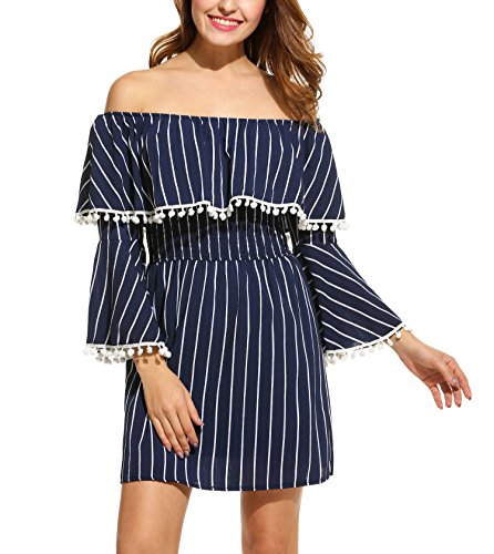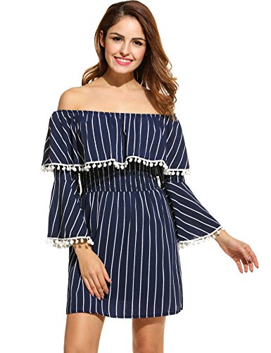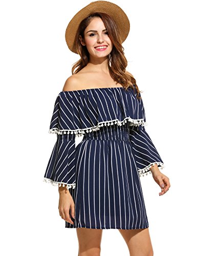 Features:Mini dress, waistline, flare sleeve, ruffles off shoulder with tassel, perfect for Spring,Summer and Autumn