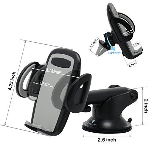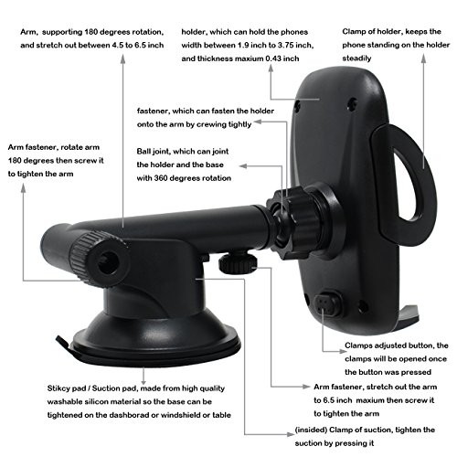 -. Feature : ▶ Multi-purpose - 3-in-1 car phone holder can be used on flat dashboard, windshield, and air vent. You are paying for one product but can place it in several different locations to save your money and time. / ▶ Newest designs ensure safe driving - iProductsUS's car phone mount is designed to adjustable arm length from 4.5 inch to 6.5 inch so you can set up it as the suitable position in your car without blocking your eyesight. It is also designed to rotate 360 degrees for holder and rotate 180 degrees for arm, which allows you to adjust your screen at perfect viewing angle without having to look down, both of them ensure you to drive safely. / ▶ Easy to use - No tools required to set up the cell phone mount, just place the base or clip on the dashboard, windshield, or air vent simply, then press the release button to open the clamps and put the phone into the holder, finally adjust the clamps to hold your phone tightly. Almost all of the smart phones can be held well width from 1.9 inch to 3.75 inch, and thickness is within 0.75 inch, a phone covered a simple leather case can be fit well too. / ▶ High quality material - the washable high quality suction pad is made from sticky silicon which is functional for dashboard or windshield between -4 to 140 Fahrenheit degrees. The suction pad will work best at a flat dashboard, it also works perfect at your desk to be used as a phone stand. / ▶ 100% no risk purchase - We are so confident in the quality of our products that we offer a 30 days return guarantee and 12-month maintain guarantee and lifetime technical support! Simply contact us to return for a full refund if you are unsatisfied within 30 days, or in case it breaks, we will replace it for free within the first 12 months if the old one can't be fixed.