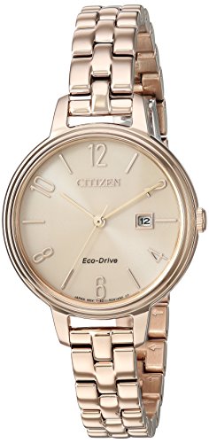 CHANDLER:Classic lines with a chic design, this CITIZEN Chandler timepiece will fit your style from day to night, making it the perfect watch for ladies. Featured here in a rose gold-tone stainless steel case and bracelet with a light brown dial and date.