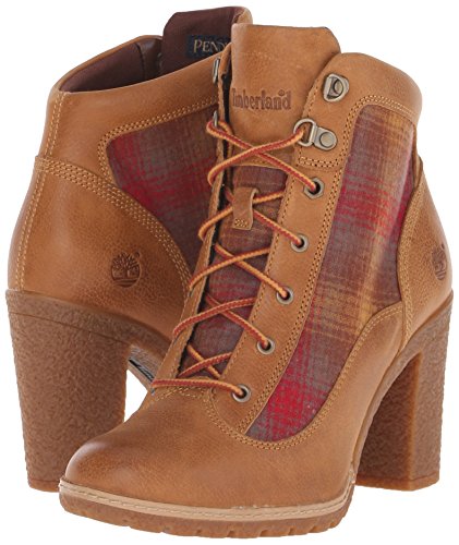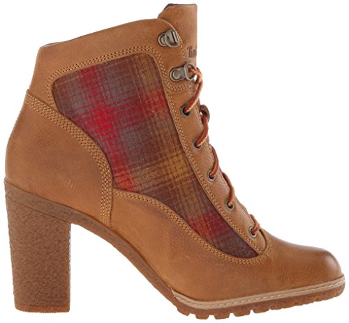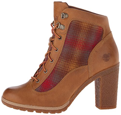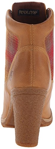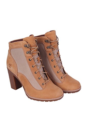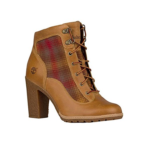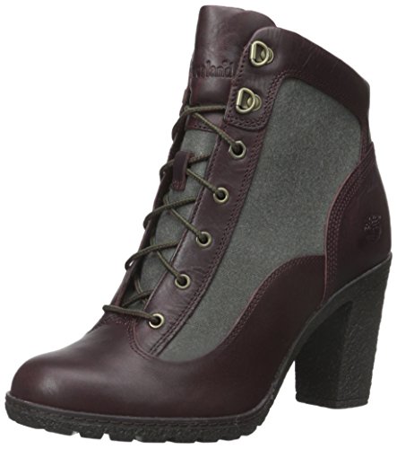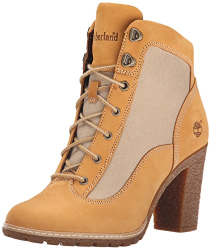 Leather boot with fabric panels featuring lace-up vamp and textured rubber heel