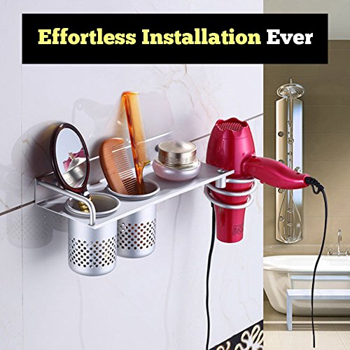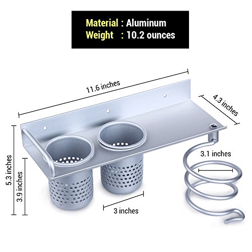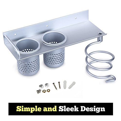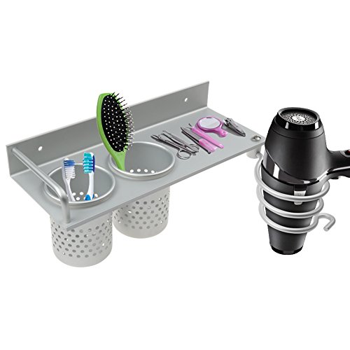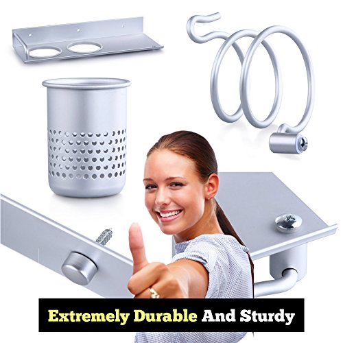 Hair Dryer Holder | Multiuse Storage Rack with Easy Install Wire Loop Hanger and 2 Cup Holder | Extremely Durable and Sturdy Aluminum Material | Simple and Sleek Design | Silver | 679.3