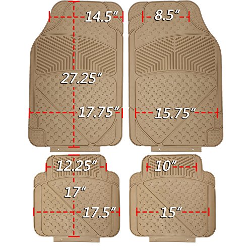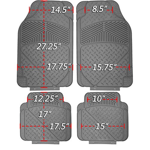 -. Feature : Set Includes: 2 Front Mats (17.7 inch x 27.4 inch), 2 Rear Mats (17.7 inch x 16.9 inch) / Easily Trimmable for a Semi-Professional custom Fit / 100% All-Weather Heavy Duty - Protects Vehicles from Dirt, Dust. Rain, Hail, Sleet, Ice, Snow / Made From 100% HD Rubber - Super Easy to Clean