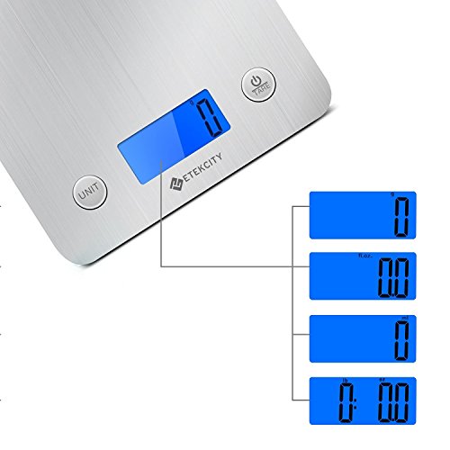 MULTI-FUNCTION: Features a crystal-clear back-lit LCD display in lb/oz, g, ml, and fl.oz. Low power, overload indication and auto-off function make weighing your foods hassle-free