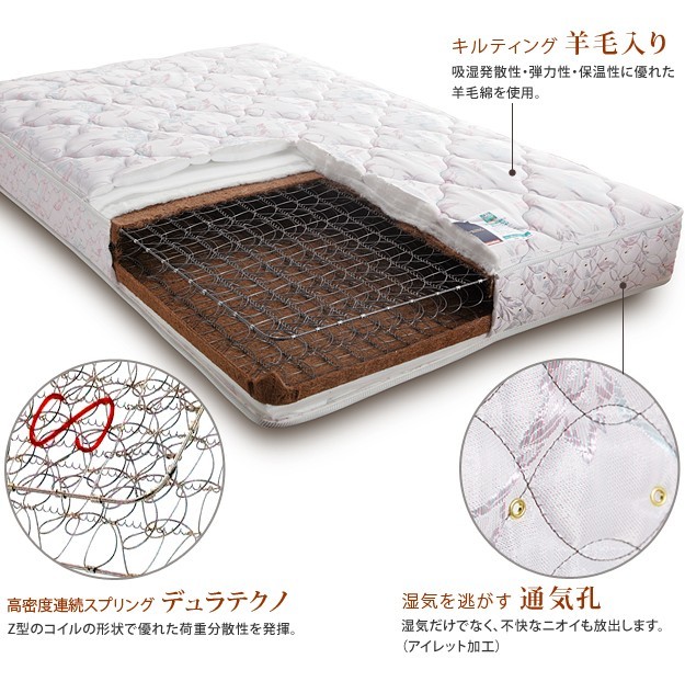 商品について:高密度連続スプリングのデュラテクノスプリングマットレス。スプリングの形状を複雑にすることで体を支えるマット面の密度を高めて、優れた体圧分散性を誇ります。詰め物に羊毛綿を入れソフト感を出し、吸湿発散性にも優れます。通気性を考慮したアイレット加工(通気孔)