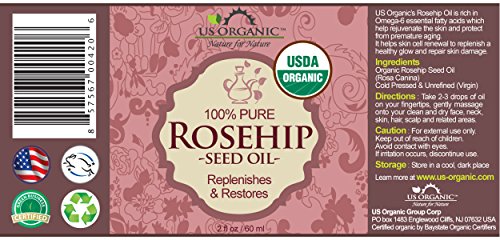 US Organic brand guarantees the highest quality. Look for USDA seal on the product for real Organic. US Organic's certified organic Rosehip Seed Oil contains essential fatty acids (omega 6,3 and 9) and full of the vitamins and fatty acids which will dramatically improves your skin. Rosehip oil is a truly remarkable natural product with amazing skin rejuvenating and hair conditioning properties. It has been used for generations by the Andean Indians of Chile who recognized years ago that Rosehip oil had exceptional healing skin care and hair care benefits. Uses for: Dry and/or rough skin Eczema, Dermatitis, Psoriasis Stretch Marks, acne scars or sun spots Dry, Dull & Damaged hair, dandruff Nourish brittle nails Premature agingFeature