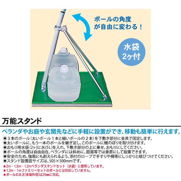 | 吉兆ベランダ用鯉のぼり スタンド水袋ポール付セット | 1.2m鯉3匹 | 1.5m鯉3匹 | 2m鯉3匹 | |