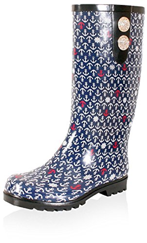Patterned rain boot featuring decorative buttons at sides