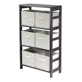 -. Title : Three Shelf Wood Storage Cabinet W Espresso Finish & 6 Baskets