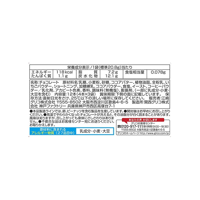 원재료:유당,소맥분,설탕,코코아 버터,식물성 기름지,전분유,딸기 파우더,쇼트닝,가당연유,코코아 파우더,식염,이스트,커피 파우더/유화 제,《아카비토》색소,향료,조미료(무기염)고, 팽창 제,(일부에 유성분 밀 대두를 포함한다)