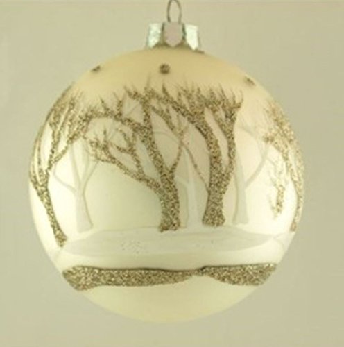 BOXED SET of 4! Christmas 3" Ball Ornaments with white Painted & Platinum Glittered Forest Design on Candlelight Background