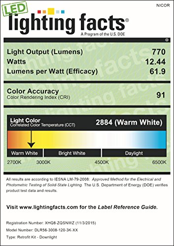 The NICOR Lighting Dimmable 800-Lumen 3000K LED Recessed Downlight Retrofit Kit for 5-6-Inch Housings, White Trim (DLR56-3008-120-3K-WH) is the perfect light for any room! The DLR 56 series continues to deliver low energy consumption, long life, and uniform illumination with true color rendering making it the perfect choice for your residential, retail or commercial projects. Putting out 800 Lumens at a color temperature of 3000K, this series gives off the perfect amount of light for every room while only drawing 12 Watts of energy! The high-performance DLR 56 features the latest technology in LED lighting to deliver the highest quality solution that is both Title 24 and CEC compliant all while backed by NICOR’s 5-year limited warranty. Upgrading to energy efficient LED lighting has never been easier or more stylishly affordable. At NICOR, we’re always looking for ways to make your light better. We continue to innovate, challenge our thinking and improve our processes. We look to earn your business by delivering progressive lighting solutions designed to balance value with the highest design performance possible. We’re determined to bring you reliable products that provide real solutions. When you choose a NICOR product, you can rest assured you’re getting a product that has been tested to the highest standards available. Our commitment is to be a leader of reliability, innovation, and excellence because we understand just how important you are.Feature