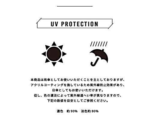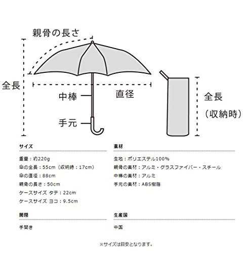 -. Feature : 本体サイズ:(全長)約55cm、(傘の直径)約88cm、(親骨の長さ)約50cm、(収納時全長)約17cm、(ケースサイズ)約22×9.5cm / 本体重量:約220g / 素材・材質:(本体)生地:ポリエステル100%、(親骨)アルミ・グラスファイバー・スチール、(中骨)アルミ、(手元)ABS樹脂 / 原産国:中国 / 開閉:手開き / 紫外線遮蔽率:(濃色)約90%、(淡色)約80%