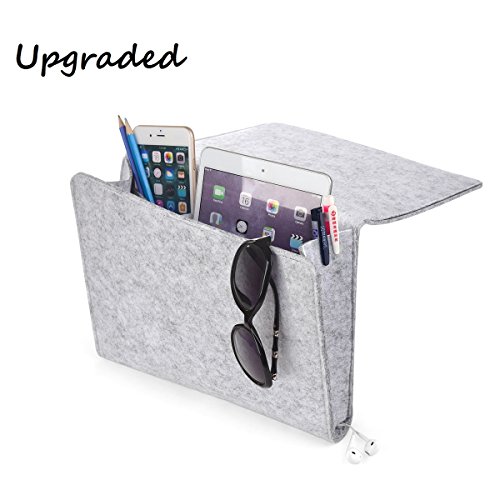 [UPGRADED] Thicker Bedside Caddy, Bed Caddy Storage Organizer Home Sofa Desk Felt Bedside Pocket with Cable Holes 2 Small Pockets for Organizing Tablet Magazine Phone Small Things Holder (Light-Gray)