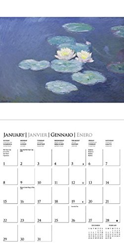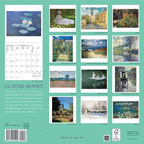 -. Artist : Claude Monet -. Binding : Calendar -. Brand : Graphique -. EAN : 9781477025024 -. Edition : 16m Wal -. Feature : Size: 12" x 12" format / Plan ahead with a 4-month preview page for 2018 / Each page includes before & after preview months / Includes public & culturally significant holidays / 4 languages: English, French, Spanish & Italian -. ISBN : 1477025022 -. Label : Graphique de France -. Manufacturer : Graphique de France -. Model : CY0317 -. MPN : CY0317 -. NumberOfItems : 1 -. PackageQuantity : 1 -. PartNumber : CY0317 -. ProductGroup : Office Product -. ProductTypeName : OFFICE_PRODUCTS -. PublicationDate : 2016-07-15 -. Publisher : Graphique de France -. Studio : Graphique de France -. Title : Graphique 2017 Monet 12" x 12", Wall Calendar (CY0317)