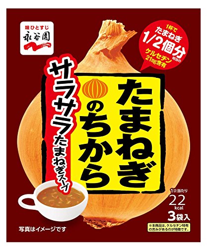 【名称】 乾燥スープ 【原材料】 オニオンエキス、砂糖、粉末醤油(小麦を含む)、食塩、酵母エキス、香味油、こしょう、でん粉、うきみ・具(ローストオニオン、パセリ)、トレハロース、調味料(アミノ酸)、糊料(キサンタン)、カラメル色素、ケルセチン 【栄養成分表示】1袋(6.8g)当たり エネルギー:22kcal、たんぱく質:0.6g、脂質:0.3g、炭水化物:4.3g、ナトリウム:522mg、(食塩相当量):1.3g、ケルセチン:21mg