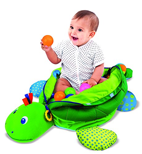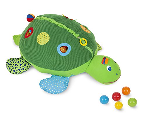 Studio : Melissa and Doug Publisher : Melissa and Doug Binding : Toy Product Description Kids will have a ball with this crinkling, jingling, multi-textured toy! The giant, friendly turtle comes filled with 60 squeezable multi-colored balls that are easy to grasp, toss, and roll. Zipper and self-stick tabs open so baby can sit inside, and close to store balls and to make a fun pillow. Features include holes to push and pull balls through, a non-slip bottom, crinkling feet, squeaking button, textured ring, mirror, silky fabric tags, and attached soft ball rattle. 0