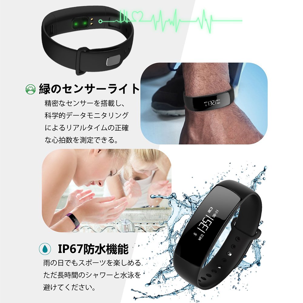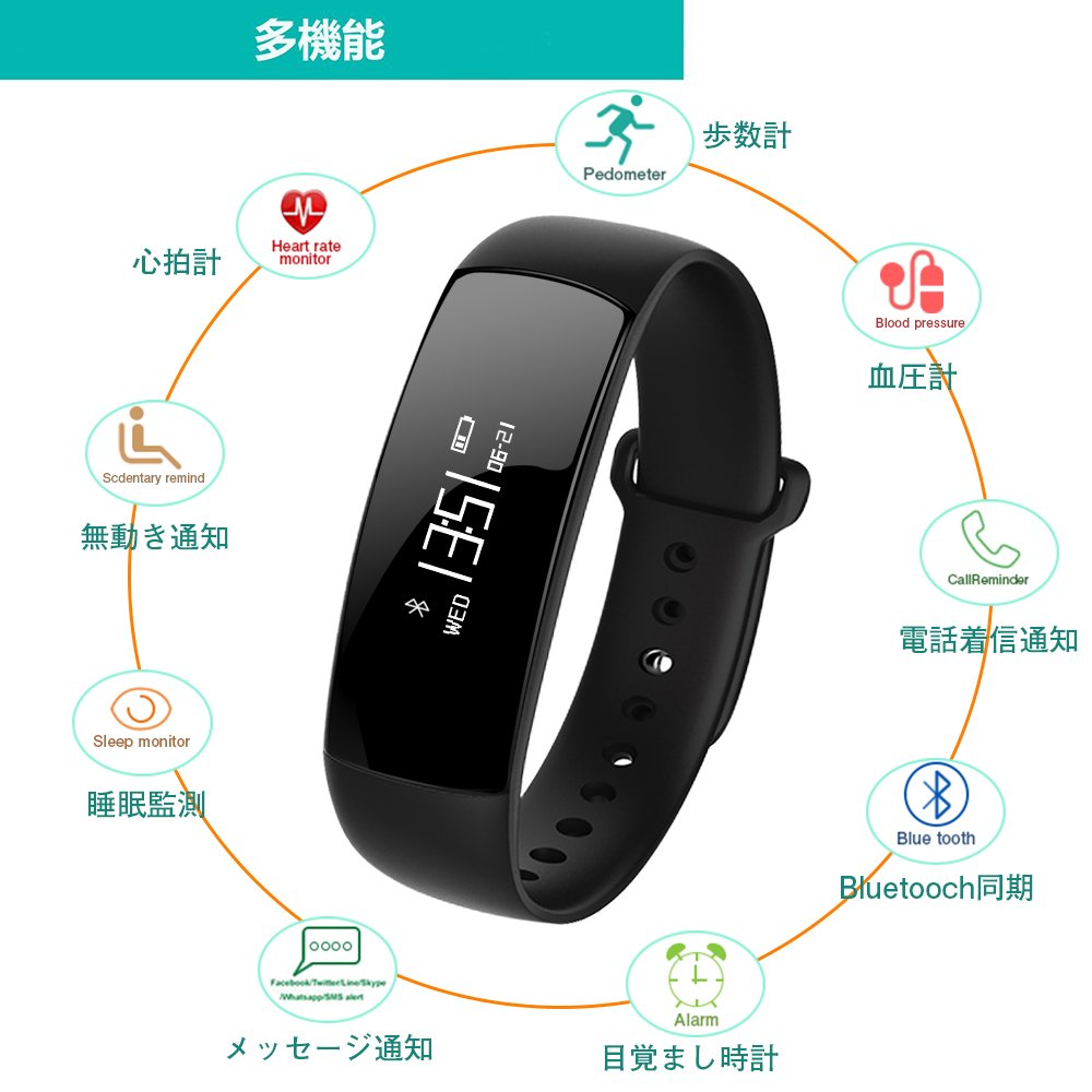 Heart rate monitor, blood pressure measurement, activity meter, movement route, automatic attention of sitting tendency, sleep monitor, application incoming notification such as telephone, alarm, data synchronization, data analysis.