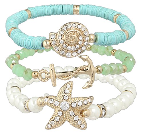 -. Feature : Set includes 3 individual nautical themed bracelets / Can be worn separately or as part of a layered look / Gold-plated with simulated pearl / Stretch design for easy fit