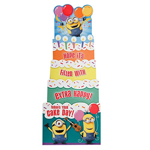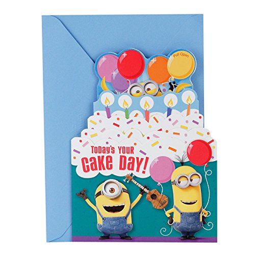 Studio : Hallmark Marketing Company, LLC Publisher : Hallmark Marketing Company, LLC Binding : Office Product Product Description Celebrate a child's birthday with this fun card featuring Minions. The message on the front of the card reads, "Today's your cake day!?" Open the card to reveal the inside message, "Two! Happy birthday! Happy birthday!" The card measures 8.3 inches long by 5.8 inches wide made with high quality cardstock paper; an envelope is included. All Hallmark cards are made with paper from well-managed forests. Hallmark was founded in 1910 when 18-year-old J.C. Hall arrived in Kansas City, Missouri, with a couple of shoeboxes of postcards under his arm and the American dream in his heart. Hallmark greeting cards are sold online and in nearly 40,000 retail stores across the globe and people continue to recognize the iconic Hallmark brand as "the very best." 0