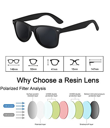 POLARIZED HD VISION LENS - 100% UV400 protection coating, blocks 99% harmful UVA&UVB rays. Reduce glare reflected off of roads, water, snow, and other horizontal surfaces. Restore true color, eliminate reflected light and scattered light and protect eyes perfectly. Polarized sunglasses cut glare and haze so your eyes are more comfortable and you can see better. This wayfarer sunglasses is designed for fishing, climbing, trekking, driving, etc.