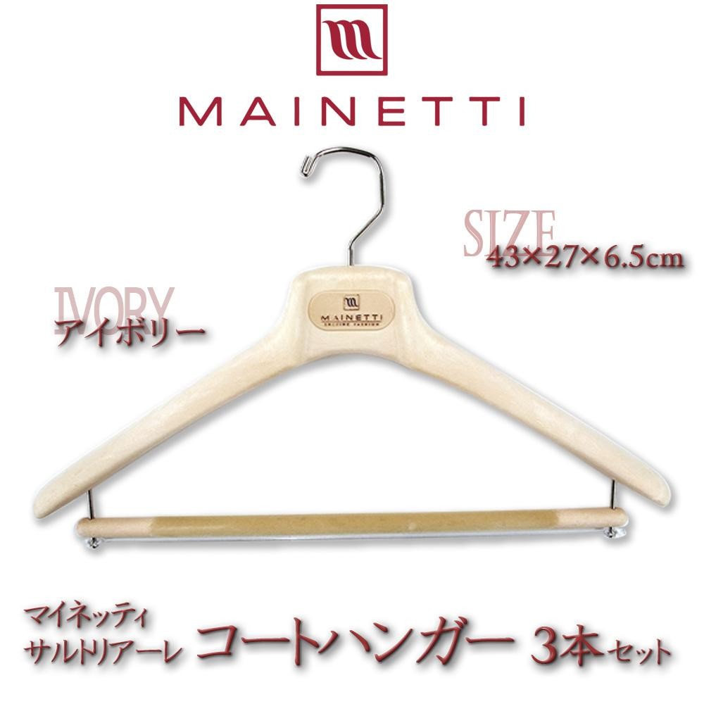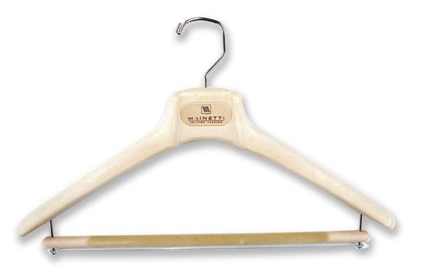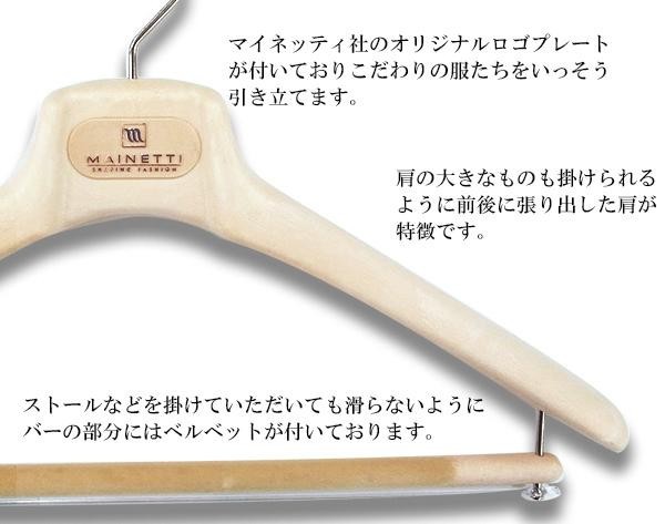 メンズハンガーとほぼ同じ形ですが、肩先(両端)を太くしたコートハンガー。コートのような肩の大きなものも掛けられるように前後に張り出した肩が特徴です。お好みでジャケットを掛けることもでき、バーの部分にはストールなどを掛けることもできます。 |