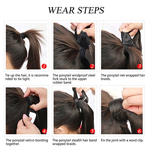 Tangle free, silky, soft, harmless material, natural appearance. Perfect for adding length volume and fullness to a ponytail or a big bun. The ponytail extension attaches with an invisible comb and has an extra section of hair to wrap around the closure, easily apply it in few minutes and provides secure and comfortable attachment for all day wear. Easy to clean and care just using a little mild shampoo in cold or warm water, then let them naturally dry.