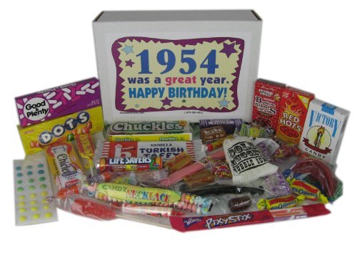 -. Binding : Misc. -. Brand : Woodstock Candy -. Feature : Contains thirty kinds of retro nostalgic candy / 1954 birthday gift box filled with nostalgic candy is sure to bring back memories to a baby boomer / Makes a fun and unique birthday gift for someone who has everything / Box measures 9.5 x 7 x 3 inches and comes shrink wrapped / Great gift for any candy lover -. IsAdultProduct : 0 -. Label : Woodstock Candy -. Manufacturer : Woodstock Candy -. PackageQuantity : 1 -. ProductGroup : Grocery -. ProductTypeName : GROCERY -. Publisher : Woodstock Candy -. Studio : Woodstock Candy -. Title : 63rd Birthday Gift Box of Retro Candy from Childhood for a 63 Year Old Man or Woman Born in 1954 - '50s Jr