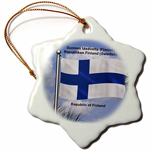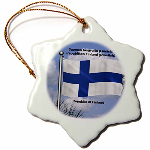 3dRose orn_58799_1 Flag of Finland Waving Against Sky with Republic of Finland Snowflake Ornament, Porcelain, 3-Inch