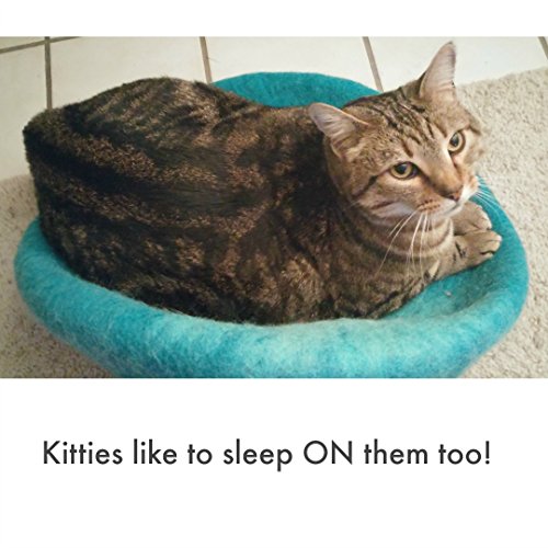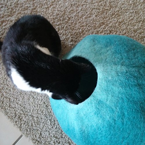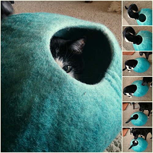 -. Feature : Secure, comfortable cat cave for kitty to stay warm and protected. / 100% natural wool provides natural heat warmth and softness. No chemical pet bedding materials used. Perfect for cats with sensitives or allergies. Cats are naturally attracted to the wool smell. / Blocks other pets from bothering kitty while napping. / Easy to clean and maintain pet bed, no extra care needed. Simply add to washing machine on wool setting and follow directions in our insert. / Soft and stylish our cozy design is a colorful teal with glacier edging very attractive for your living room, den or bedroom areas.