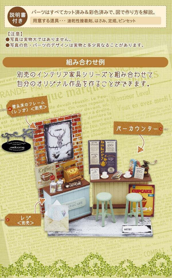 コーヒーショップのバーカウンターをかわいく再現したミニチュアキットです。単体でインテリアとしても、ミニチュア作品のアクセントとしてもピッタリです。分かりやすい説明書付きなので、初心者の方でも楽しく簡単に作ることができます。 |