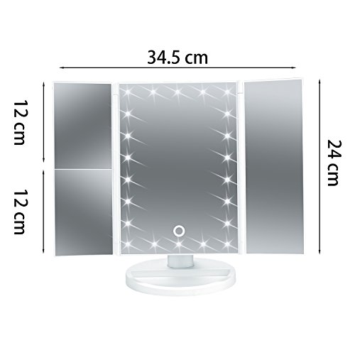 - 【22 LED VANITY MIRROR WITH DIMMABLE LIGHTS】: 22 LED bulb with ON/OFF touch button, allow you to do make-up in the dark or daylight. Long press to dim or brighten the lights. When unfolded, the size is 13.5" (W) x 6.3" (L), please confirm whether it's the size you want.