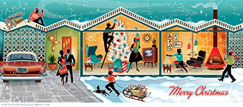 - This card features A mid century modern house being decorated for Christmas.