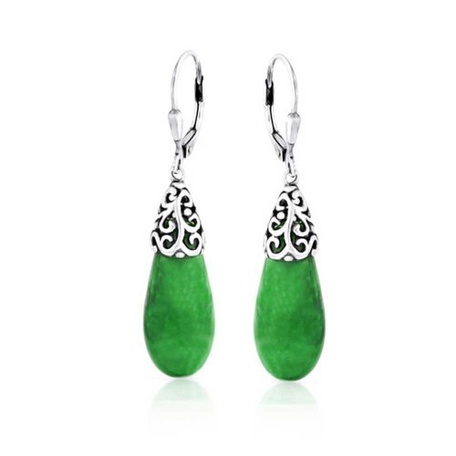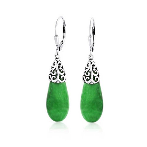 A brand new pair of filigree Jade earrings will certainly help to brighten your day. The dainty filigree design at the top of each sterling silver jade earring adds a very feminine look to this feminine accessory. The teardrop shaped Jade stone features flecks of color in varying shades of greens that are quite lovely and will add a great pop of color to your style. A simple touch of bright color may be all your need to spice up an ordinary outfit and our Jade drop earrings are perfect for that. Green Jade jewelry has been beloved by many for centuries for its beauty and Jade is considered by many to bring good luck. The combination is unbeatable and our genuine Jade earrings are proof of that. Order a pair today for a look you will love. Our Jade teardrop earrings will stay on your ears very securely because of the leverback design of the backing.Feature