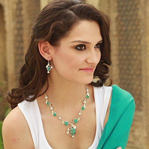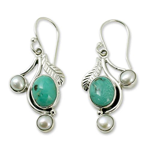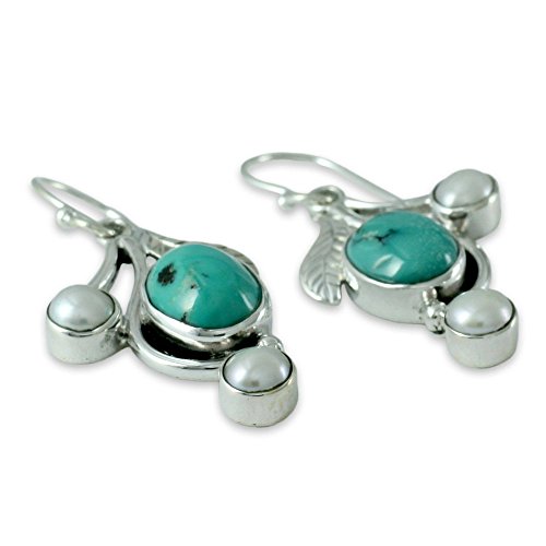 About this item: Like floral buds on silver ivy, cool blue gemstones adorn earrings of feminine allure. Neeru Goel sets turquoise on sterling tendrils caressed by pearls. Her design becomes extraordinary handcrafted earrings. .925 Sterling silver