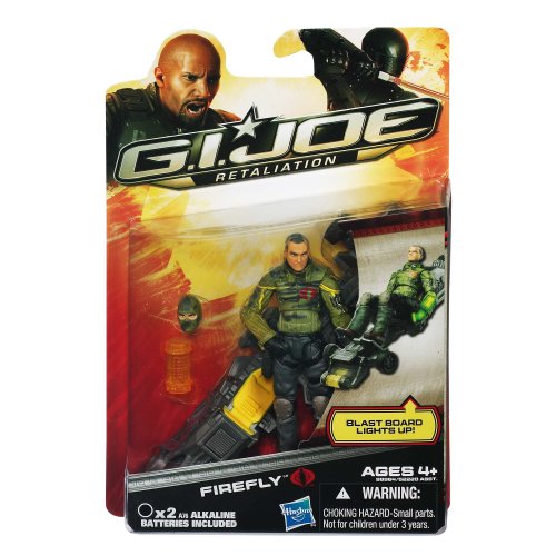 -. Binding : Toy -. Brand : G. I. Joe -. EAN : 0653569757559 -. Feature : Rough and ready Firefly figure comes heavily armed / Power-charged blast board lights up / Attach the figure's hands to the board and press the button to activate light / Board launches canister / Figure comes with an extra head -. IsAdultProduct : 0 -. Label : Hasbro -. Manufacturer : Hasbro -. Model : 98964 -. MPN : 98964 -. PackageQuantity : 1 -. PartNumber : 98964 -. ProductGroup : Toy -. ProductTypeName : TOYS_AND_GAMES -. Publisher : Hasbro -. Studio : Hasbro -. Title : G.I. Joe Retaliation Firefly Action Figure -. UPC : 653569757559 -. Warranty : No Warranty