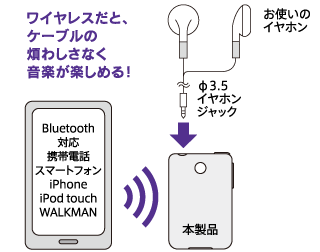 ???お手持ちのヘッドホン、イヤホンを接続し、Bluetooth対応のスマートフォンや携帯電話、携帯音楽プレーヤーなどとワイヤレスで接続でき、プレーヤーをかばんやポケットにいれたままでも快適に、高音質な音楽を楽しむことができます。
