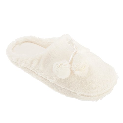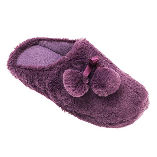 Binding : Apparel Product Description Womens quality faux fur slippers. Decorative ribbon bow with pom-poms. Fleece lined interior for warmth and comfort. Firm sole with engraved grip. Choice of two colors three sizes. Upper: Textile. Lining: Textile. Sole: Textile, Other Materials. 0