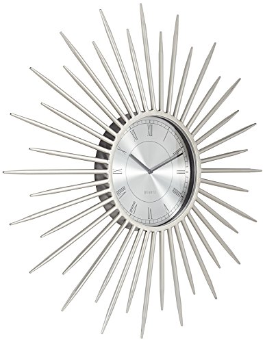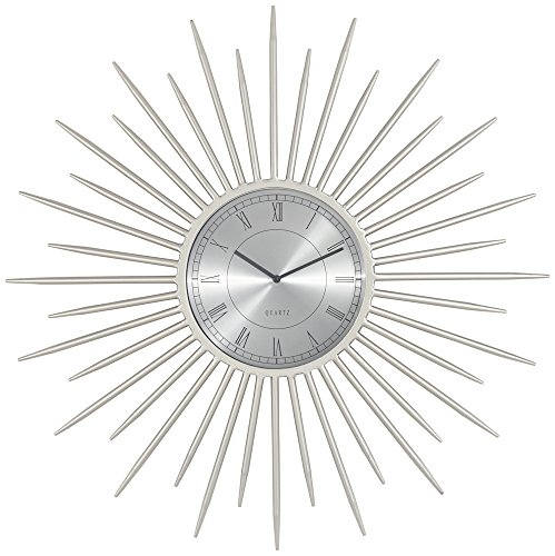 -. Feature : 28" wide and high x 1 3/4" deep x weighs 5 lbs. / Sunburst style wall clock in a sleek silver finish. / Round center clock face with Roman numerals. / Black finish clock hands and markings. / Battery powered clock; uses 2 AA batteries (not included).