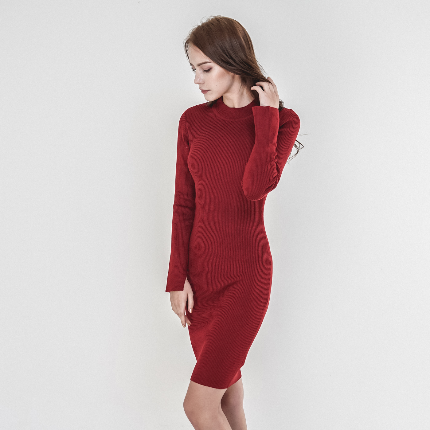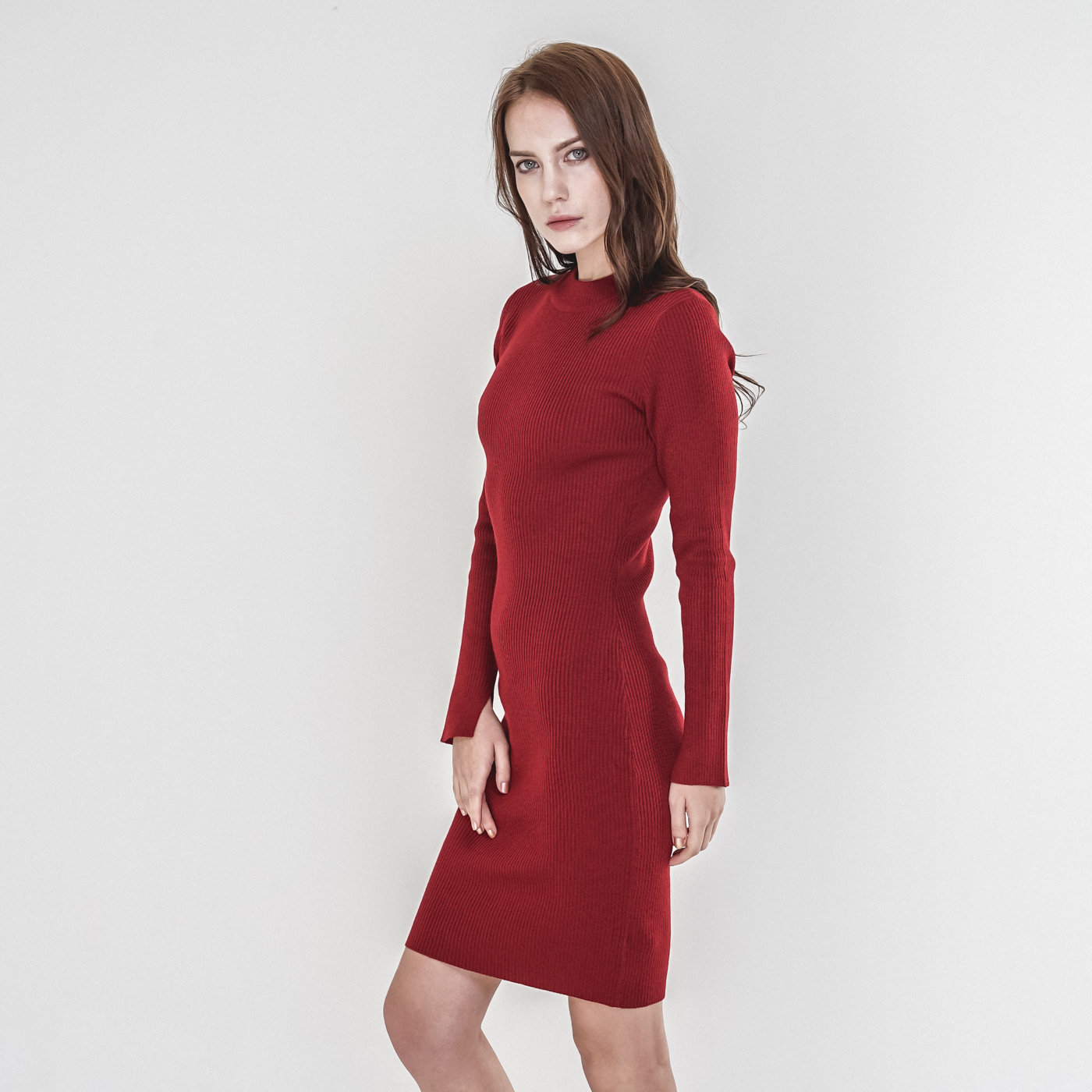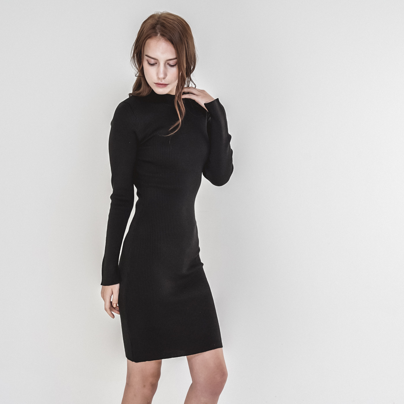 슬림해 보이는 하이넥 니트 원피스로 레이어드 하기좋은 아이템 디자인입니다.