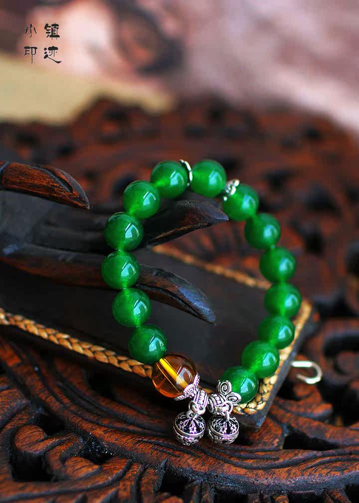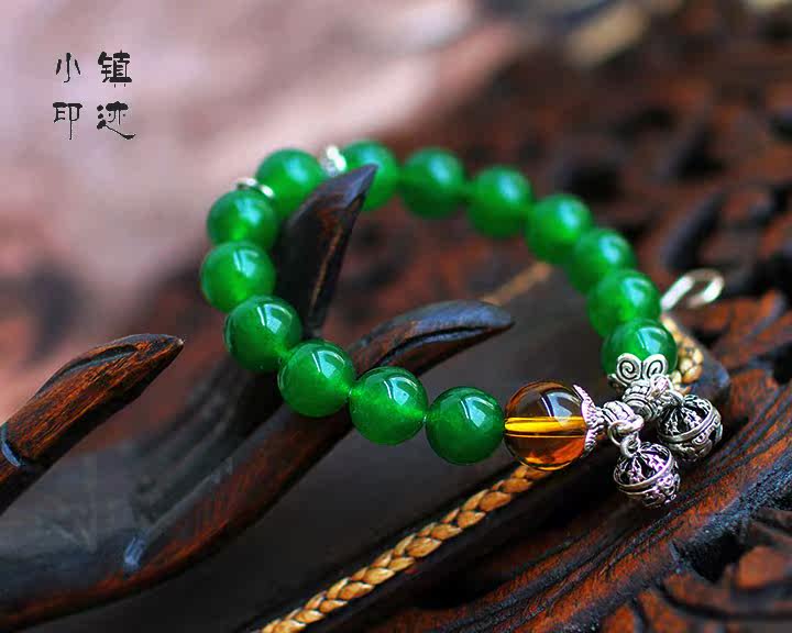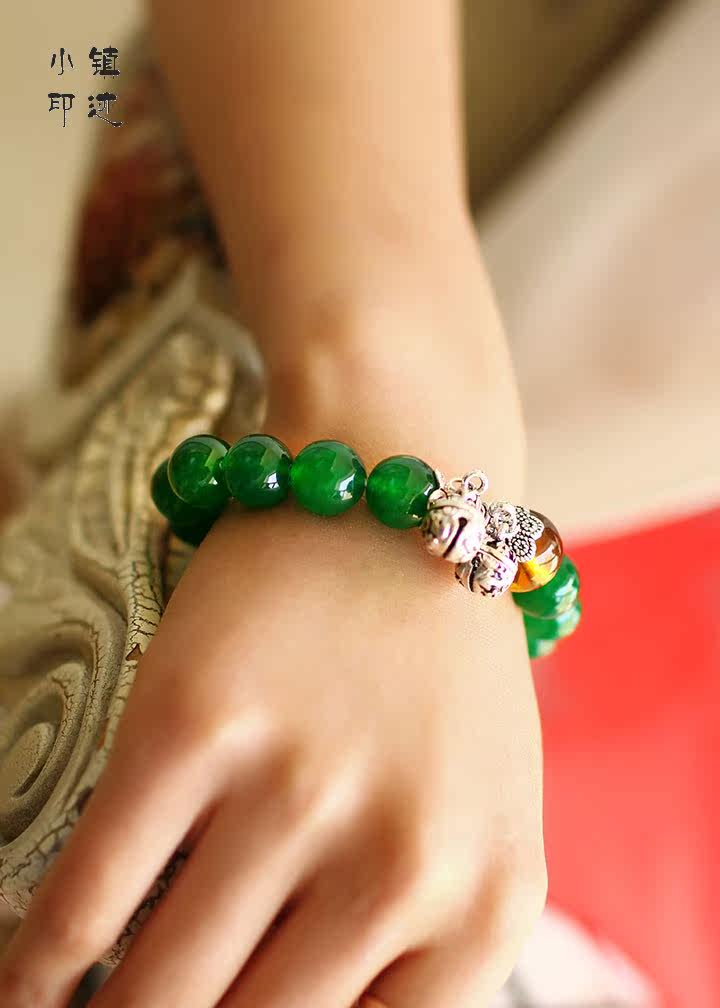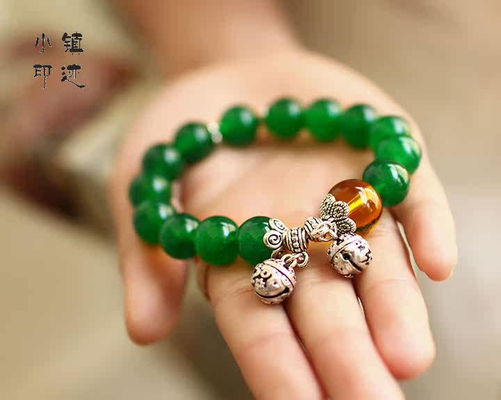 Specifications: Bracelet fold about 11cm (including pendants), green agate diameter of about 11mm, crystal diameter of about 13mm, bell diameter of about 9mm